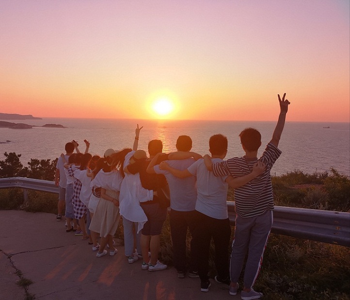 抵達長島已是下午,稍事休息后,伙伴們集體前往住宿地點附近的山頂,趕上了壯美的日落。爬山的過程并不輕松,陡峭的山路有些難走,爬到山頂大家都是氣喘吁吁,但看到落日的絕美,深感值得。海天交接處金色的太陽逐漸隱去耀眼的光芒,余暉鋪滿海面,在短暫的時間里,太陽徹底沉入了海面。年輕的伙伴們震撼于眼前的美景,也更深的領(lǐng)悟了一寸光陰一寸金的奧義。