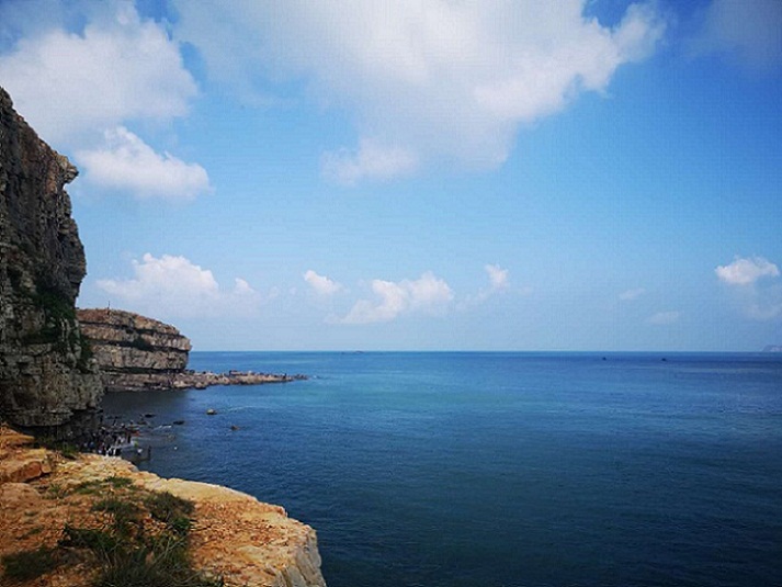 第二天上午,目的地是長島北線的九丈崖和月牙灣公園。九丈崖由于崖壁高且險峻而得名,因為海蝕作用,海邊崖壁直立。踏進月牙灣,步步珠璣,鏘然作響。月牙灣的海灘不同于一般沙灘,而是經(jīng)過海浪無休止的沖刷磨礪而逐漸變圓形成的球石長灘。這里處處都是歲月與風雨留下的痕跡,我們不禁紛紛贊嘆于大自然的鬼斧神工。